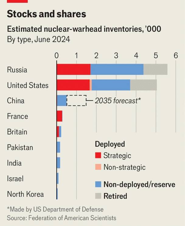 Россия приостановила ключевые части Нового СНВ, хотя обе стороны заявляют, что они по-прежнему соблюдают его ограничения для «стратегического» (т. е. дальнего радиуса действия) оружия: 1550 развернутых боеголовок и 700 ракет и тяжелых бомбардировщиков. Россия, похоже, не заинтересована в возобновлении переговоров по контролю над вооружениями. Китай, желая чего-то более близкого к паритету со своими коллегами, никогда не заботился о них. А нервные союзники Америки хотят большего ядерного сдерживания, а не меньшего.
