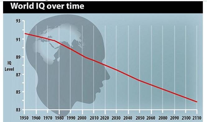 «Исследования показывают, что в современном обществе идёт отрицательный отбор по генам, которые способствуют высокому уровню образования и интеллекта, а также хорошим показателям физического здоровья. Этот вывод сделан, в частности, по результатам масштабного исследования 110 тыс. человек. Скорость деградации невелика, но достаточна, чтобы средний IQ снизился на 30 пунктов за тысячу лет, что означало бы «распад цивилизации». («Экстраполяция всегда опасна»! 1000 лет авторов я бы заменил на 20-60 лет, время смены 1-3 поколений). Т. А. Эдисон верно заметил: «Большинство людей готово безмерно трудиться, лишь бы избавиться от необходимости немножко подумать».