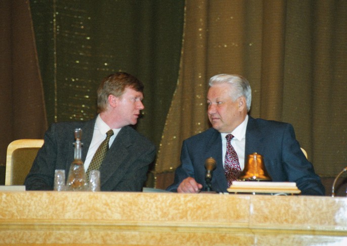 Фото: Александр Чумичев/ИТАР-ТАСС. Президент РФ Борис Ельцин и Анатолий Чубайс в президиуме во время расширенного заседания правительства, 1995 год.
