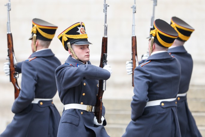 Фото: Владимир Гердо/ТАСС. Гвардейцы роты специального караула Президентского полка во время церемонии развода пеших и конных караулов на Соборной площади Кремля.