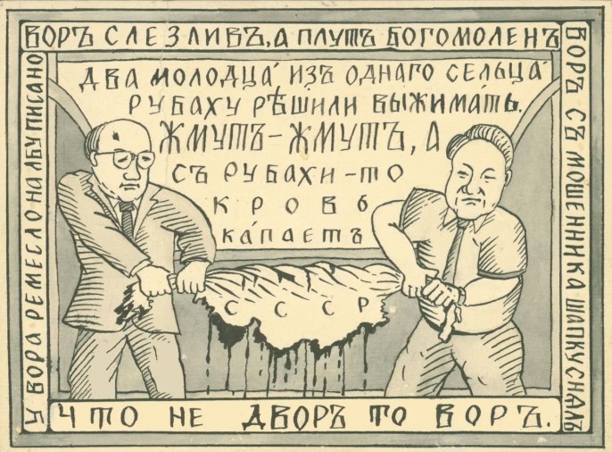 Илл. сатирический "лубок" Андрея Фефелова, опубликованный в газете "День" в начале 1991 года