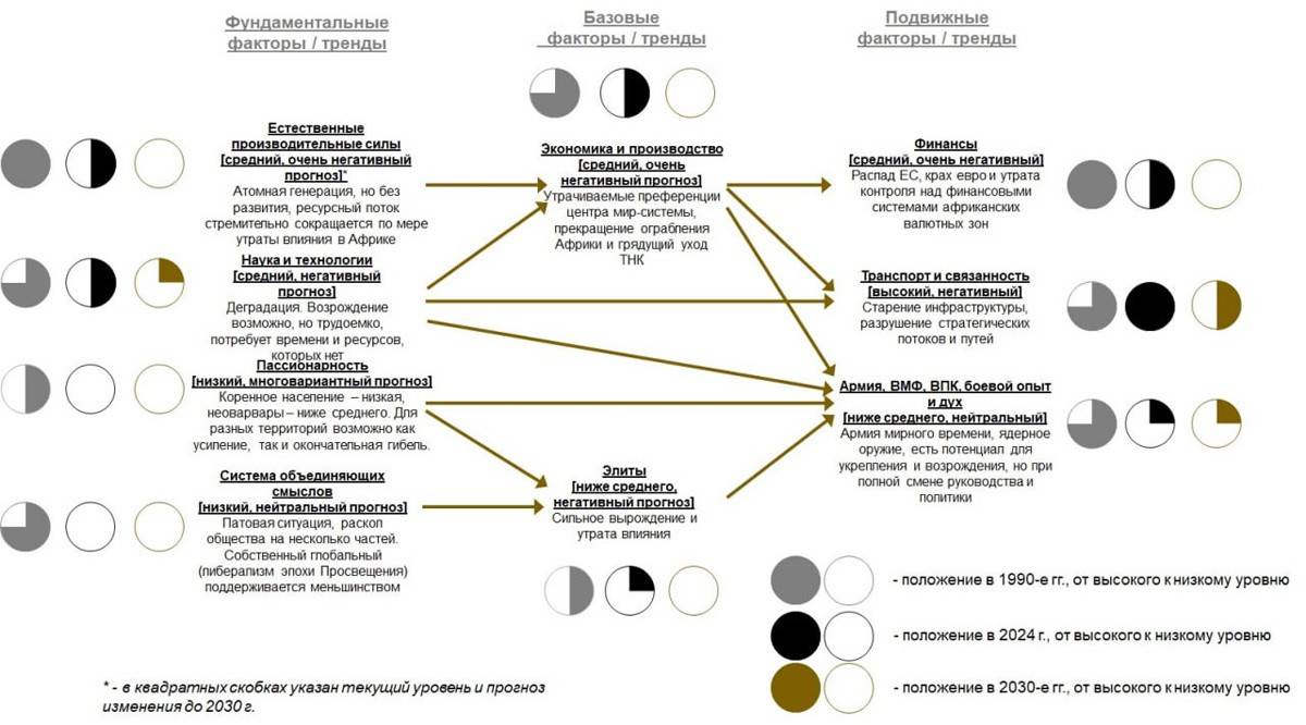 В последние десятилетия на наших глазах происходила гибель и вырождение западноевропейской цивилизации. Если у отдельных её частей шансы на возрождение и сохранность субъектности остаются («Америка отцов-основателей», романо-католическая Южная Европа), то французская культурно-цивилизационная общность практически обречена. В 90-е гг. положение казалось непростым, но некритичным (см. Рисунок), особенно на фоне психоисторической катастрофы России. К настоящему моменту практически ничего из былого не осталось, а исходя из проявленных трендов и инерционного сценария, уже в начале 30-х гг. даже текущее положение будет казаться утраченным благополучием.