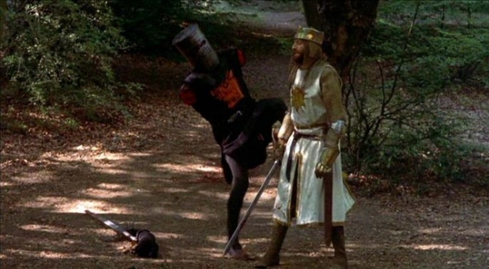 Илл. Кадр из фильма "Монти Пайтон и Священный Грааль". Встреча короля Артура с Чёрным рыцарем.