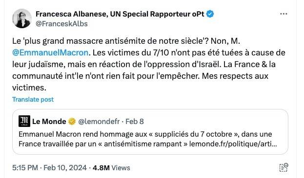 Неправильно приписывать теракт 7 октября только ХАМАСу, но также неправильно игнорировать тот факт, что существует два ХАМАСа. Эта ложь позволяет представить операцию « Потоп Аль-Аксы» как масштабный антисемитский погром, по словам президента Эммануэля Макрона, в то время как на самом деле это был акт Сопротивления, как отметила Франческа Альбанезе, докладчик ООН по правам человека на оккупированной палестинской территории.