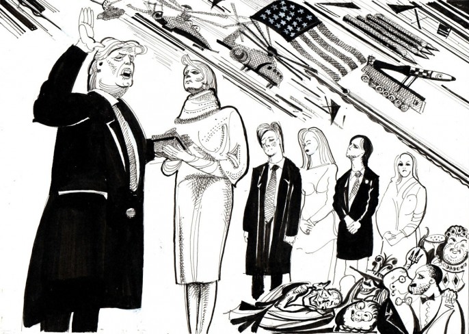Трамп кладёт свою лапищу на американскую Конституцию, а его маленький, сложенный в трубочку рот вещает о неколебимом величии Америки. Внимательно слушаем инаугурационную речь Трампа, не снимая палец со спускового крючка, дающего старт "Орешнику".
