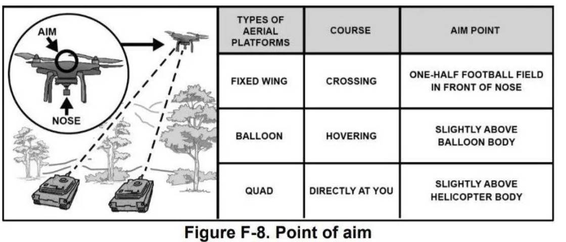Для работы по БПЛА «классического», более привычного типа, маленьких габаритов даны рекомендации по упреждению. Вряд ли рекомендации, приведённые в дополнении к мануалу, действительно могут помочь бороться с дронами в критической ситуации. В статье под названием «Сбивать беспилотники из танков» Мэтт Уайт поясняет, что данные рекомендации являются упрощенными. Приведу цитату: