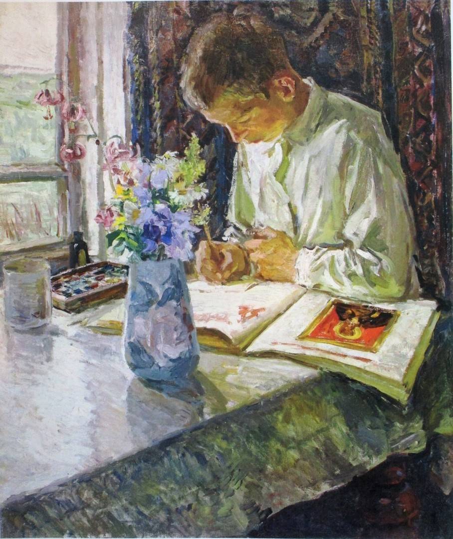 Целый раздел экспозиции посвящён Аркадию Пластову и его знаменитой вещи «Сенокос». Правда, самой картины здесь нет – есть этюды и наброски, прошествовавшие «Сенокосу». Пластов довольно долго выбирал натуру. Вроде бы ничего сложного – в Средней Полосе много живописных мест. Но нет. Требовалось интенсивное созвучие света и тени, земли и неба. На этом фоне - мирный труд во имя Родины и во имя жизни. Восхитительны этюды – «Цветы и травы», «Берёза», «Облака». Пластов был реалистом с импрессионистским вкусом – тут всё подчинено динамике и настроению. Прогретая солнцем земля отдаёт свой жар, воздух напоён духом полевых цветов, шелестят листья берёз. Остановись мгновенье, ты прекрасно! Однако же колхозники и не думают останавливаться – впереди мирные заботы о счастье. Тут же – «Рисующий у окна», портрет сына Николая, будущего художника и фотографа. Юноша склонился над альбомом, а перед ним – букет в скромной вазе. То, с чего начинает каждый юный художник.