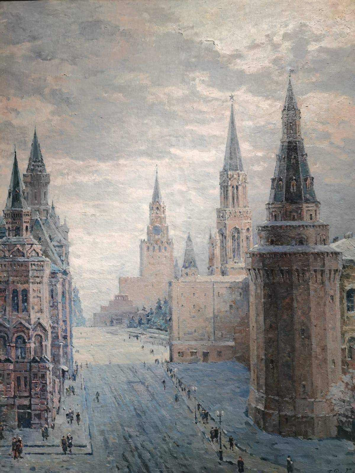 А вот и «Москва. Кремль» Бориса Рыбченкова. Точка сборки. Чёткий ритм башен. Древние поверья. Рыбченков любил Москву, причём забирался в самые отдалённые уголки, где переулочки терялись в окраинах, заросших лопухами. «Москва. Кремль» - это, скорее, исключение из общего правила, и краснокирпичная цитадель выглядит не помпезно, а словно по-старинке, когда Москва ещё не была столицей.