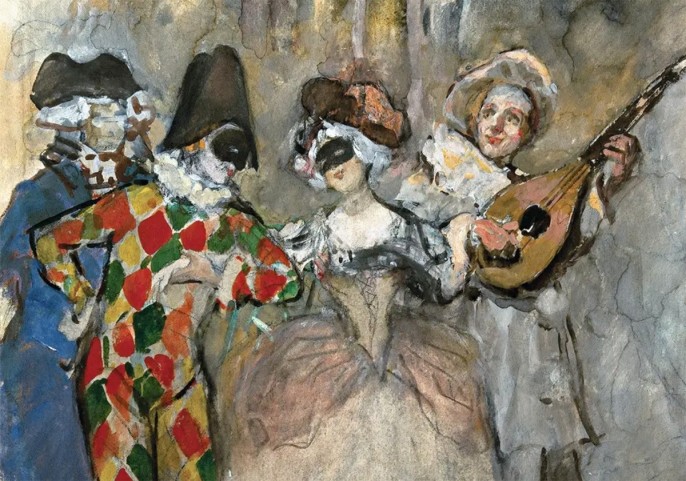 «В глухих коридорах и в залах пустынных / Сегодня собрались веселые маски, / Сегодня в увитых цветами гостиных / Прошли ураганом безумные пляски», - изящно витийствовал Николай Гумилёв. Маскарад – опасная игра, где можно притвориться, кем угодно – и принцессой, и Золушкой. Увлечь и увлечься. Посмеяться, пройтись фривольным танцем по залам, а потом – испытать разочарование. Здесь перепутано всё – под маской различимы глаза, но и они часто лгут. «О принц! - улыбаясь, присела, В кадрили вы наш vis a vis», / И томно под маской бледнела От жгучих предчувствий любви», - в стихотворении Анны Ахматовой описана легкомысленная связь на маскараде. «И бледный, с букетом азалий, / Их смехом встречает Пьеро: / «Мой принц! / О, не вы ли сломали / На шляпе маркизы перо?» - испорченная шляпа, как символ подмоченной репутации, но, поскольку все лица скрыты, ничьё реноме не пострадало.