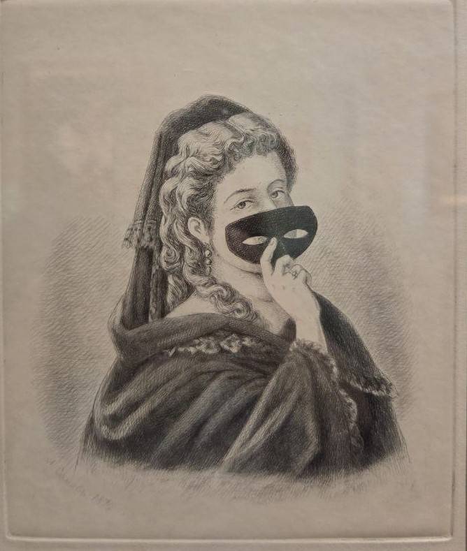 Маскарады проводились в дворянских и купеческих собраниях, в имениях и домах аристократии, а по праздникам – на центральных улицах. С гравюры Андрея Сомова «Барыня с маской в руке» на нас глядит незнакомка, пожелавшая скрыть себя от зрителей. Остаётся загадкой - она кокетничает или за кем-то следит? А, быть может, наслаждается пёстрой компанией. Вот «Автопортрет в маскарадном костюме» Александра Муравьёва. Мастер изобразил себя в костюме испанского гранда – с пышными рукавами и стилизованным воротником-фрезой.