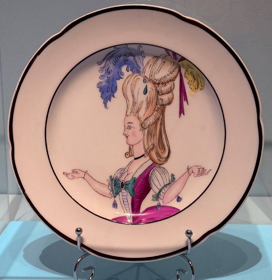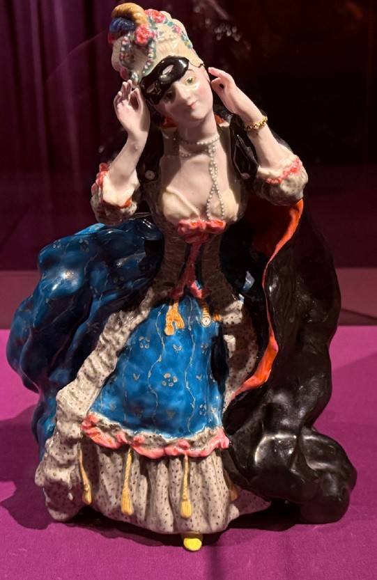 Вот и знаменитая статуэтка «Дама с маской», созданная по эскизу Константина Сомова. Пленительно-грациозная франтиха, кокетливо склонившая головку для поцелуя. Ах, благоухали розы Версаля, но, увы, и они оказались сметены бурями Французской революции. Фарфоровая пластика фиксирует игру тканей на юбке и то мимолетное движение, что подвластно не каждому художнику. Это - поэзия женщины-куклы в кружевах, рюшах и пудренном парике. Где тот ловелас, что заворожил сердечко финтифлюшки? Гильотина уравняла всех. Ещё одно фарфоровое чудо – «Екатерина II в маскарадном костюме». Фигурка, имевшая массовый выпуск, была создана на Императорском фарфоровом заводе.