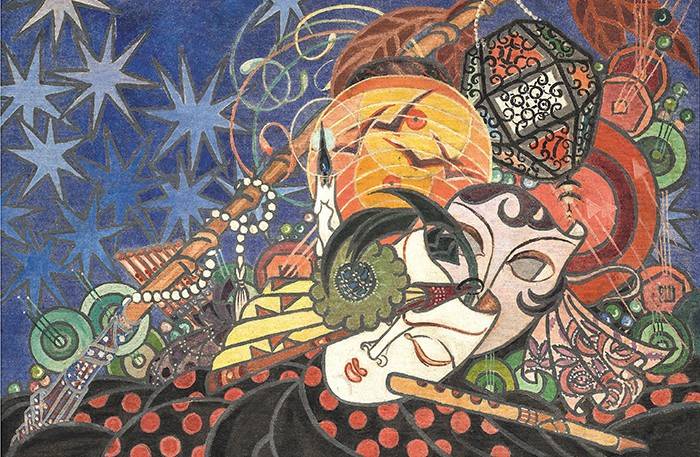 Чуть поодаль – затейливый рисунок Анны Ремизовой-Васильевой «Придворная дама на маскараде». Капризница благосклонно принимает ухаживания коленопреклонённого Пьеро. Это лестно – слушать лирику эмоций, однако, на лице чаровницы написана скука. Пьеро – это печаль, а жаждется беспрестанных развлечений и острых моментов. Где-то там, за колонной, ожидает коварный виконт де Вальмон – вот это приключение! «Маскарад» Николая Сапунова – это типичная сценка, где шаловливая девушка выбирает Арлекина и отворачивается от Пьеро. Картина – сочна и красочна. Огни фейерверков и таинственный свет китайских фонариков – в такой атмосфере хочется забыть о повседневности и предаться флирту.