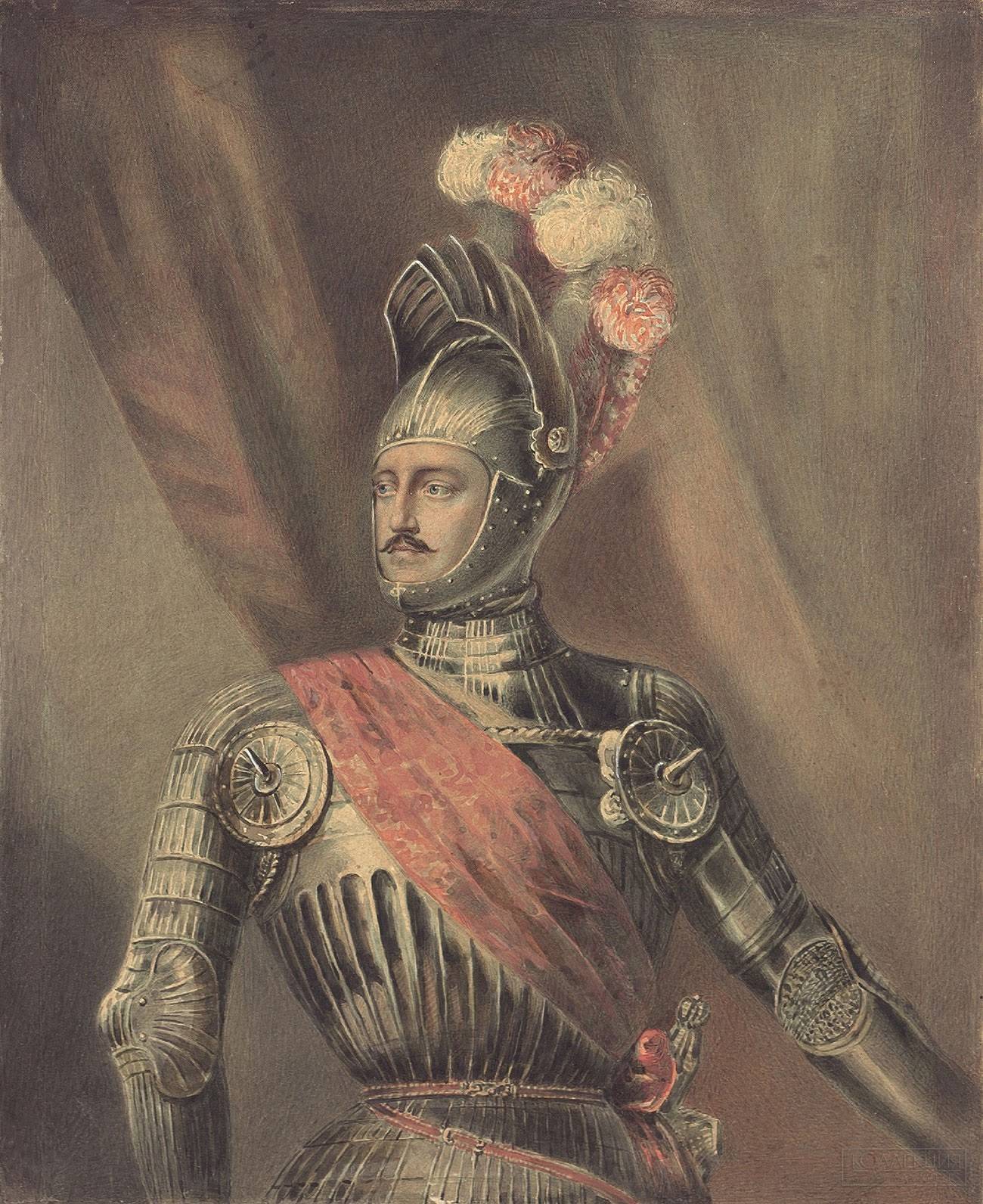Перед нами – портрет императора Николая Павловича в стилизованных рыцарских доспехах. Это – костюм для Царскосельской карусели в честь двадцатипятилетия союза Николая с Шарлоттой Прусской. Карусель – это вовсе не аттракцион, а конная игра, появившаяся в эру Возрождения – карусель включала парадную выездку, выступления всадников и даже конный балет. Николай I, обожавший помпу и маскарады, устроил феерическое действо – для себя и всей Европы.