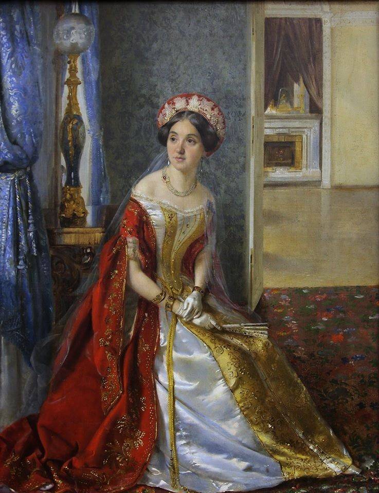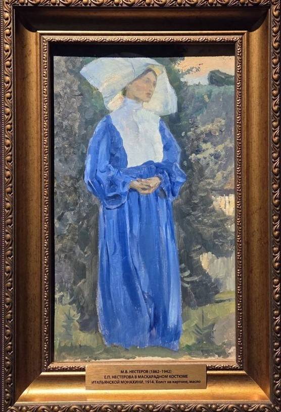 Картины, явленные в экспозиции, дают полноценное представление о нарядах, которые были востребованы женщинами – это цыганки, принцессы, коломбины, донны в мантильях и всё те же боярышни. Идеален портрет стройной и строгой мадам в костюме итальянской монахини – это Екатерина Васильева, вторая супруга Михаила Нестерова. Интенсивность белого и синего – такое сочетание рождает успокоенность, благорастворение, тишину.