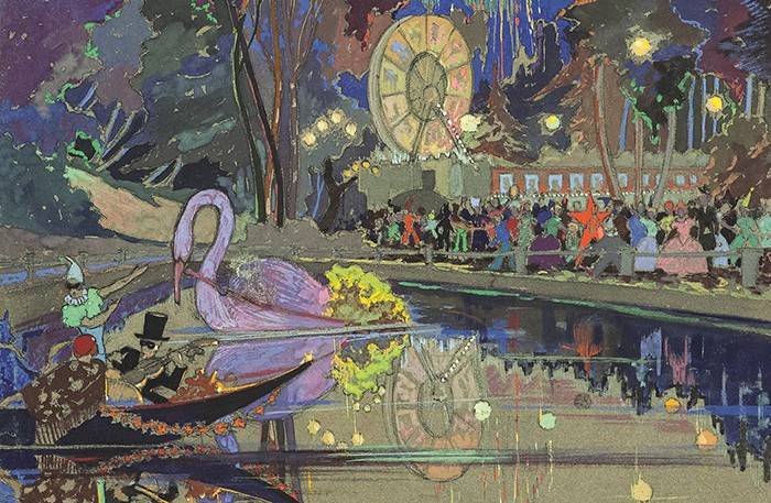 После революции шло активное отрицание всего «барского» - от привычек и вкусов до эстетики. Бытовали полит-карнавалы, где пролетарии носили чучела Чемберлена и скандировали вирши, наспех сработанные синеблузниками. В 1930-х вернулись и дорические капители, и парки в духе Андре Ленотра, и кинофильмы о «хороших» царях. Пришлись ко двору и волшебные маскарады. На картине Бориса Тимина «Карнавал в парке культуры и отдыха» - всё те же маски – Пьеро, Арлекин, маркиза в платье на фижмах и некто в чёрном цилиндре – это уже не буржуй, но опереточный Мистер Икс. Фейерверк, фонарики, лодки, увитые цветами, и, если бы не алая звезда, присутствующая в оформлении, нам показалось бы, что это расслабляются какие-нибудь господа в поместье князей Голицыных. Советская власть сделала дворянские обычаи привилегией масс.