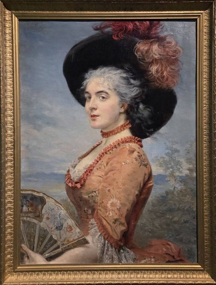 На картине Эрнеста фон Липгарта «Портрет молодой женщины в черной шляпе» - дама в костюме Галантного века, с распахнутым веером. Как это мило – вообразить себя маркизой де Помпадур, взмахнуть опахалом и застыть перед восторженным художником. Тогдашние заказчицы обожали позировать в образах осьмнадцатого столетия.