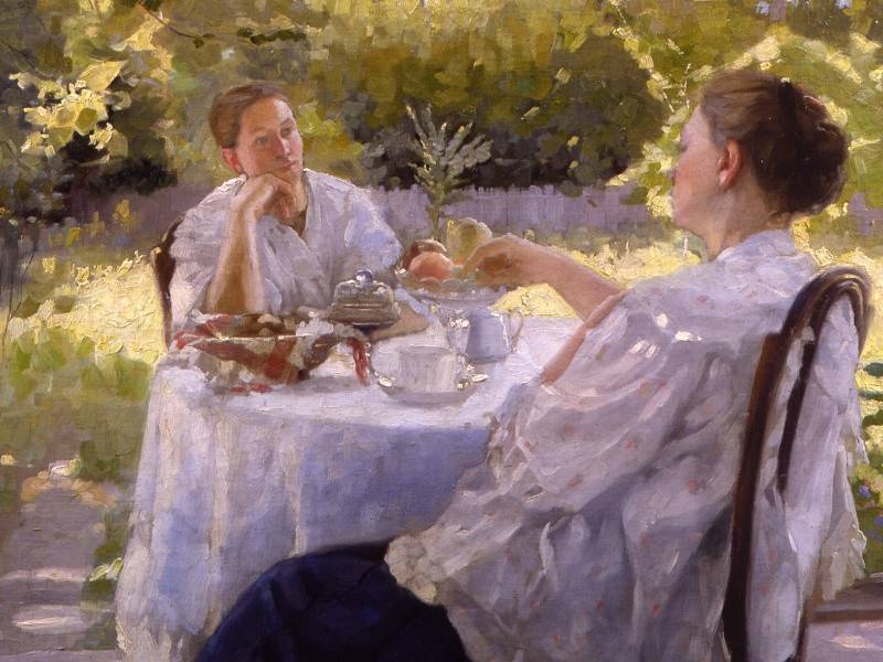 На выставке – целый ряд малоизвестных полотен. Тому пример – «Чаепитие» Лукиана Попова. Две дамы в светлых блузах сидят за столом, что накрыт прямо в саду. Изумителен мягкий свет, обволакивающий фигуры. Мы наблюдаем за беседой. О чём речь? Сплетни о подруге или обсуждение театральной премьеры? Или говорят о неспокойной политической ситуации? Или о заграничных модах? Мы не можем подслушать, но можем видеть спокойное течение бытия, которое будет вскоре нарушено войной и революциями.
