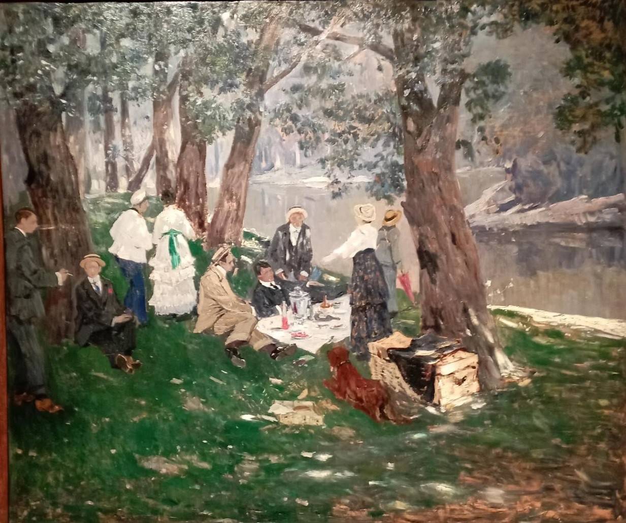 Любопытна вещь Алексея Исупова «Пикник», повторяющая один из главных импрессионистских сюжетов – отдых на природе. Нарядная компания на берегу пруда – флирт, разговоры, лёгкие закуски. По-французски смотрится и работа Роберта Фалька «Молодые стволы» - в то время Фальк активно увлекался парижским стилем. Весна, юные деревца, мягкий, льющийся отовсюду свет. Близкая к манере Клода Моне вещь Игоря Грабаря «В утренней росе» - это гимн свежести.