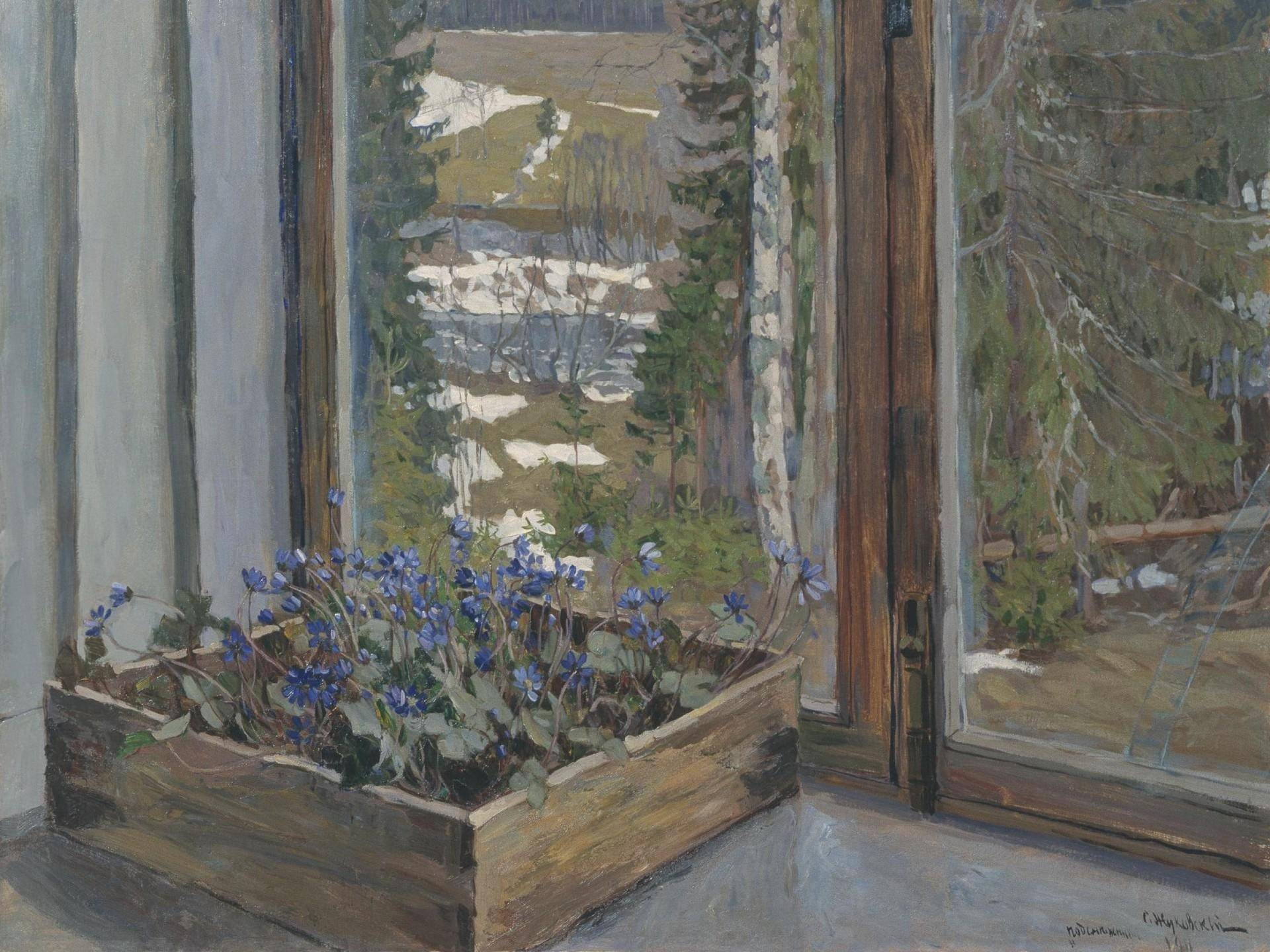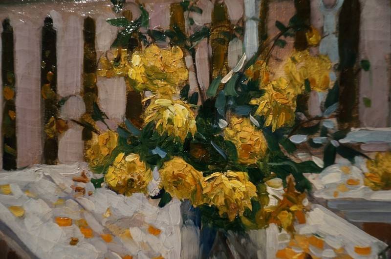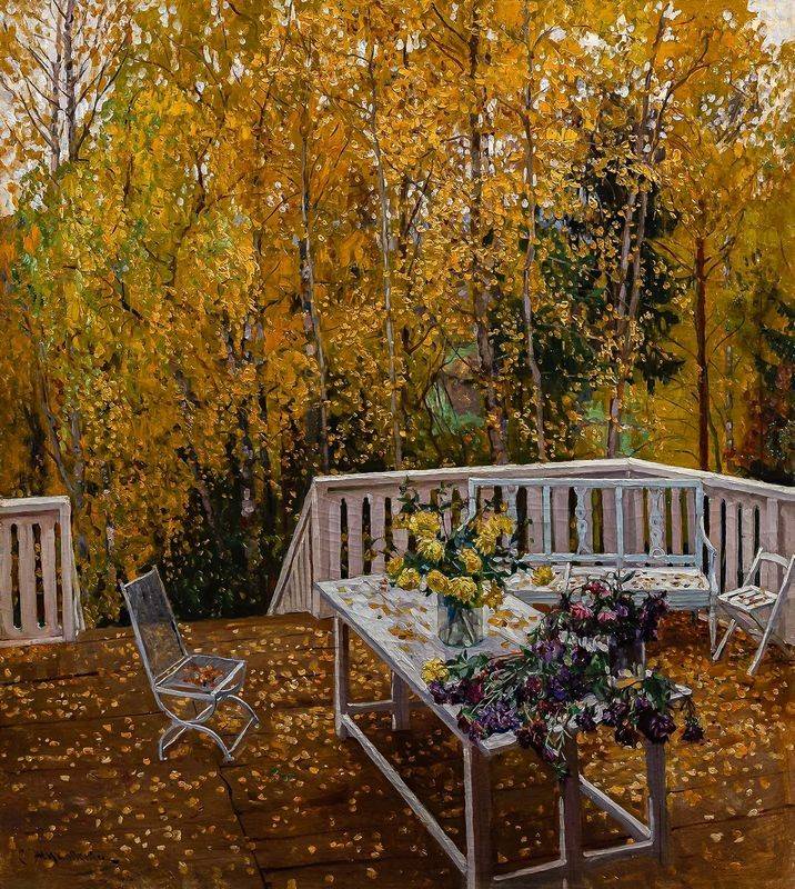 Иное время года на картине Станислава Жуковского «Терраса. Осень». Броско-жёлтые оттенки – лес, опавшие листья и букет цветов, носящих поэтическое название «золотые шары». Полупрозрачное пространство, день – хрустален, отблески прощальных солнц. Представляется, что должно пахнуть антоновскими яблоками – поздними плодами летних урожаев. Печаль смешивается с радостно-тревожным ожиданием – осень время итогов и решений. Собственно, Жуковский – настоящий «певец» русских усадеб и его полотен тут несколько. Прекрасен «Интерьер» с белыми креслами, нежны «Подснежники» - вестники весны, величественна и слегка грустна «Усадьба Рождествено».