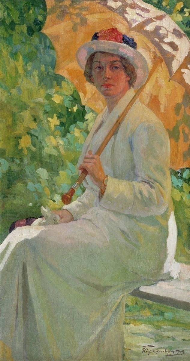 А вот - портрет актрисы Надежды Комаровской, написанный Константином Коровиным. Она - не просто одна из моделей художника, но и его гражданская жена. Общество слегка осуждало творческую пару за распущенность нравов, но богема есть богема – у неё свои законы! Итак, молодая женщина сидит у окна и глядит на нас с выражением томной меланхолии, столь не свойственной ей в жизни и творчестве. То была деятельная особа, игравшая главные роли. Очаровательна безвестная «Девушка под солнцем» Ивана Горюшкина-Сорокопудова. Летний день, солнечное марево и – в руке у девушки большой зонтик, защищающий от лучей – парасоль. Тень от деревьев создаёт причудливые узоры. Жарко.