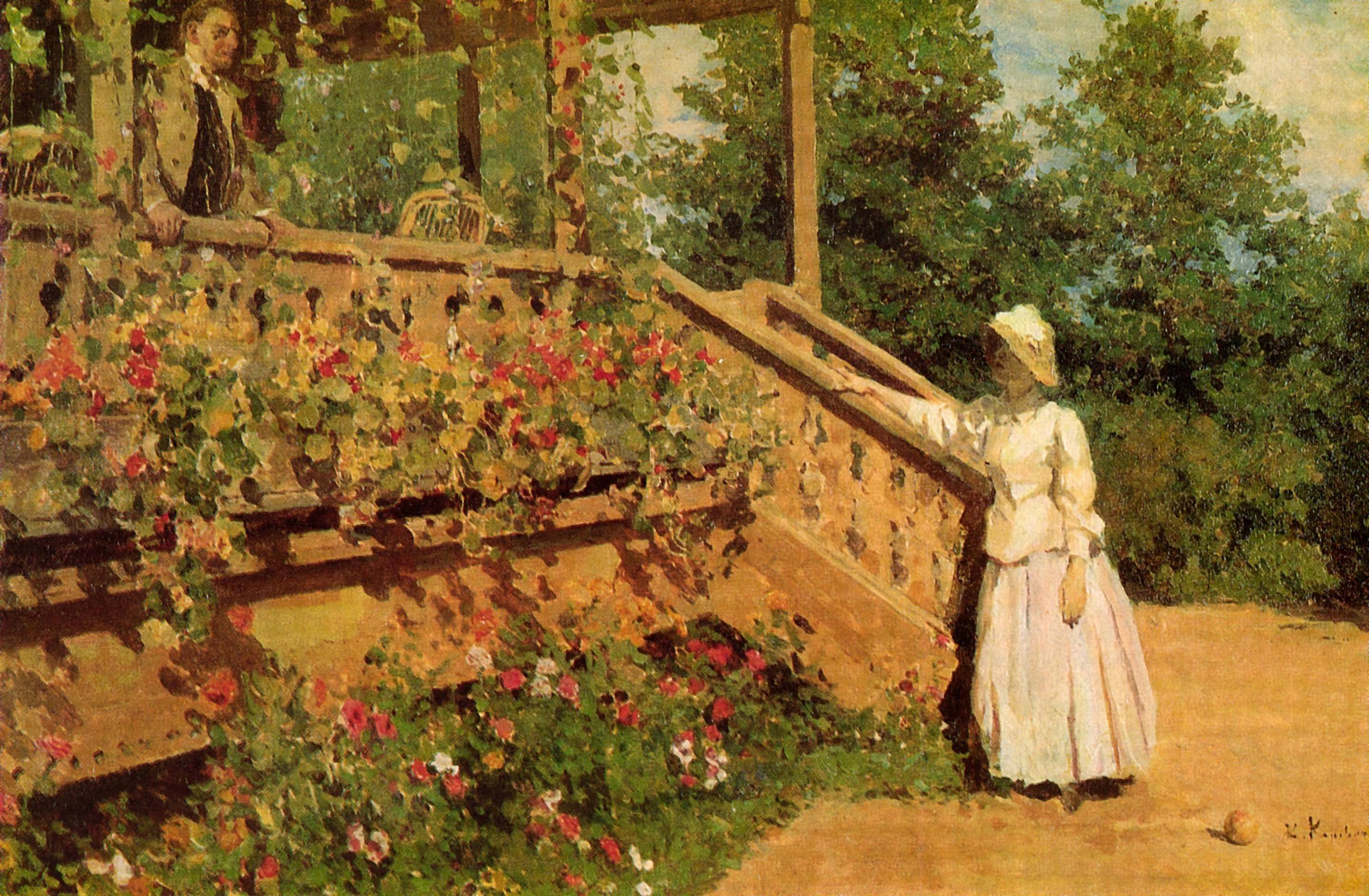 А тут – «Настурции» Константина Коровина. Ясный и ярчайший день. Усадьба или дача. Некая дама в светлом платье пришла в гости к местному кавалеру. То ли начало, то конец романа. Или это соседи, которые лишь здороваются? Настурции – предлог, ибо здесь – фабула. Оранжевая интенсивность цветов контрастирует с зелёным фоном. Сочное и такое короткое наше лето! Вечерний сюжет Ивана Куликова «Фонарики в саду» — это предвкушение летнего праздника. Накрыт стол с самоваром. Венские стулья. Скатерть – бела. Дети вешают китайские фонари, эти непременные спутники тогдашних развлечений. Окутывающий уют и тихое счастье.