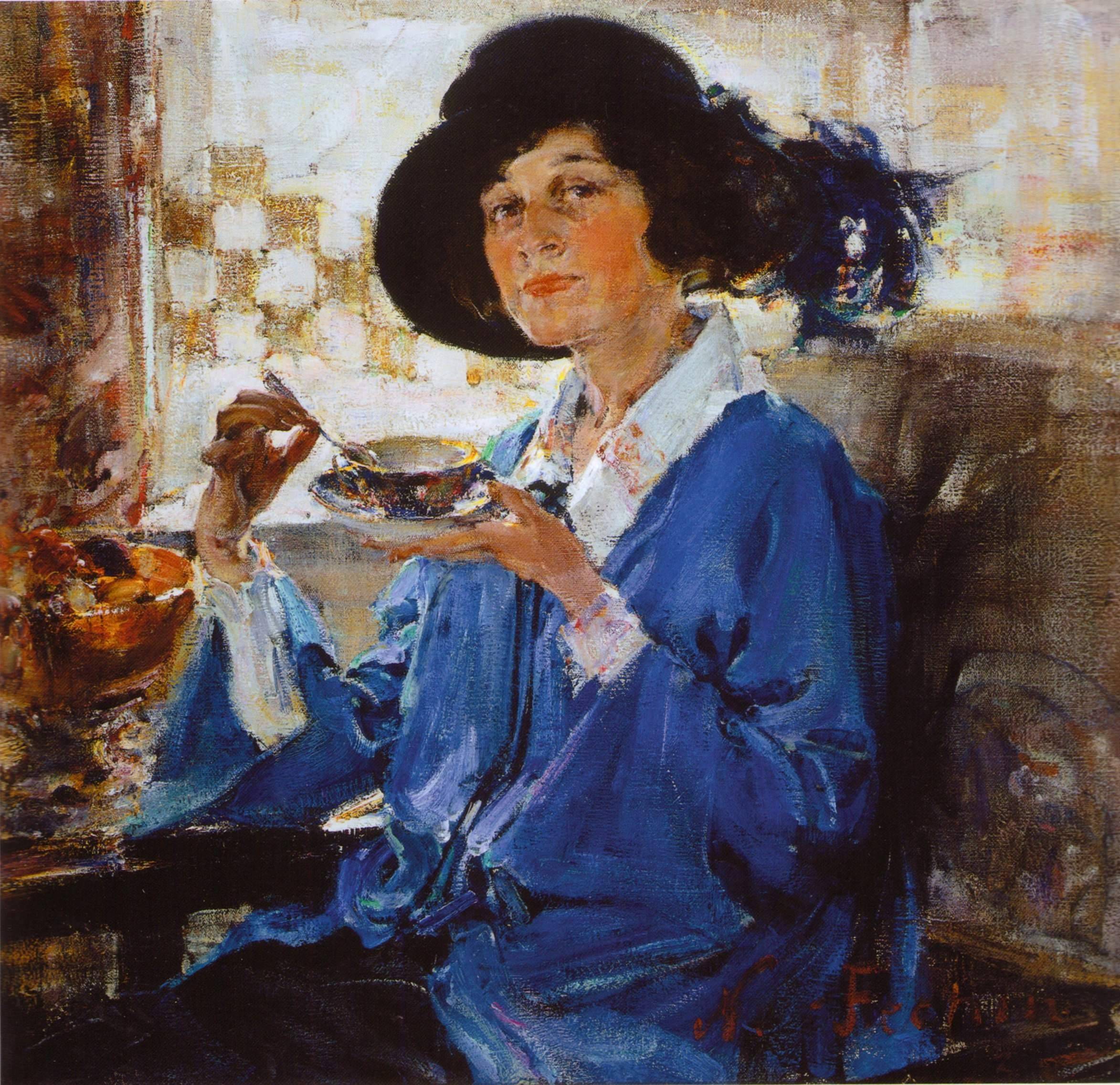 На выставке много женских портретов. Обращает на себя внимание некая миссис Крэг в исполнении Николая Фешина. Он, как никто умел показать мимолётность бытия. Миссис – за чаепитием, и художник словно бы отвлёк её от этого полезного занятия. Лицо Крэг – надменно, и она то ли демонстрирует нам чашку, то ли выказывает самоё себя – в синей блузе и чёрной шляпке. Мадам не просто красива, но и обладает интересной, запоминающейся внешностью. Другая картина Фешина называется эффектно – «Золотые волосы». Впрочем, хороша и сама героиня, глядящаяся в зеркало. В руке – папироска. Этакая эмансипе. Буйный вихрь красок, мажорность в каждом нюансе, торжество оттенков. В этой вещи – темперамент художника и модели. Тут всё – громко и солнечно, где-то даже крикливо.