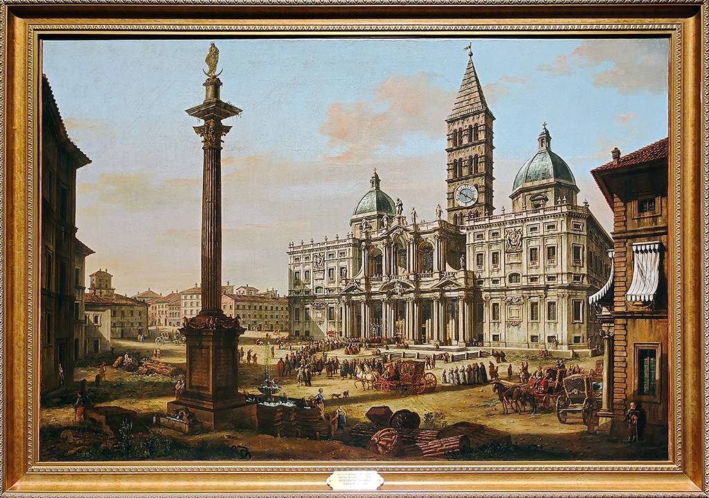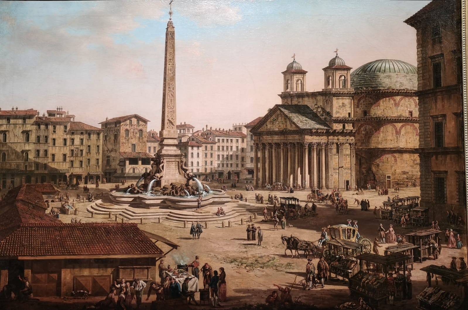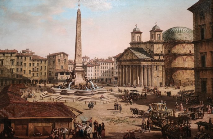 В экспозиции можно увидеть целый ряд ведут, как живописных, так и графических, а также ознакомиться с именами художников, работавших в этом жанре. Вот, например, Бернардо Белотто – племянник и последователь самого Джованни Антонио Каналетто, и если дядюшка подвизался в родной Венеции, то сеньор Белотто обосновался в Риме, а затем ездил по всей Европе. Его кисти принадлежат ведуты «Пьяцца Навона», «Вид площади с церковью Санта Мария Маджоре на Эсквилинском холме», «Вид Римского форума» и ещё несколько шикарных работ из коллекции Пушкинского музея. Тут и шествие монахинь, и раззолоченные кареты, и толпы.