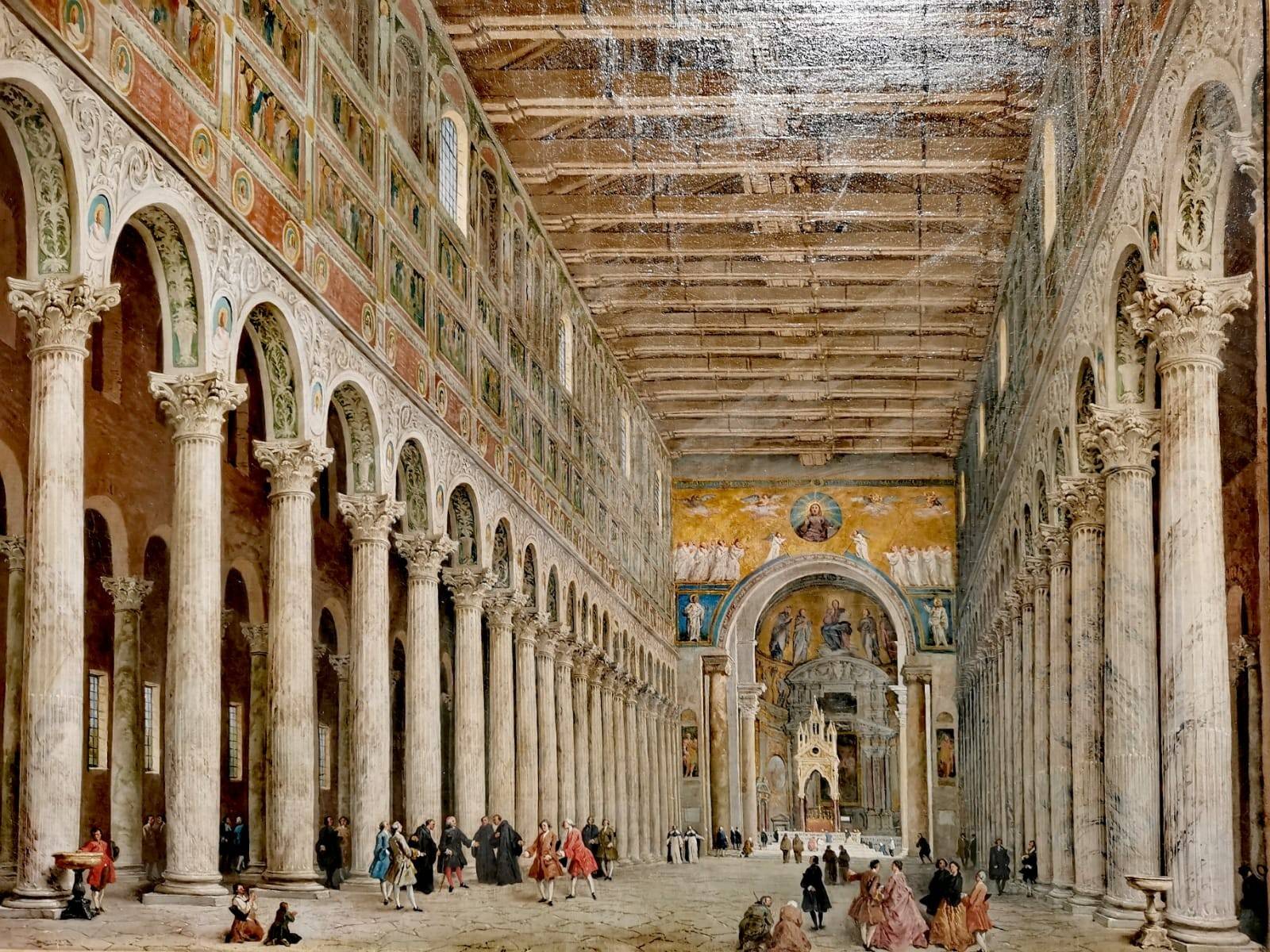 А вот – другой знаковый художник, Джованни Паоло Панини, мастер, начинавший с росписей дворцов, но потом сделавшийся одним из лучших авторов ведут и знатоком архитектуры. Он даже преподавал в Королевской академии живописи в Париже, а французы всегда крайне ревниво относились к иноземцам, а к итальянцам – с наибольшим пристрастием. Панини обращал внимание не только на сами здания – его интересовали костюмы, поэтому по его ведутам можно изучать моды XVIII столетия. «Внутренний вид церкви Сан-Джованни ин Латерано» — это не лишь роскошная базилика, но и чарующие одеяния прихожан – пудреные парики да расшитые камзолы мужчин, пышные фижмы дам, общая нарядность, присущая рококо.