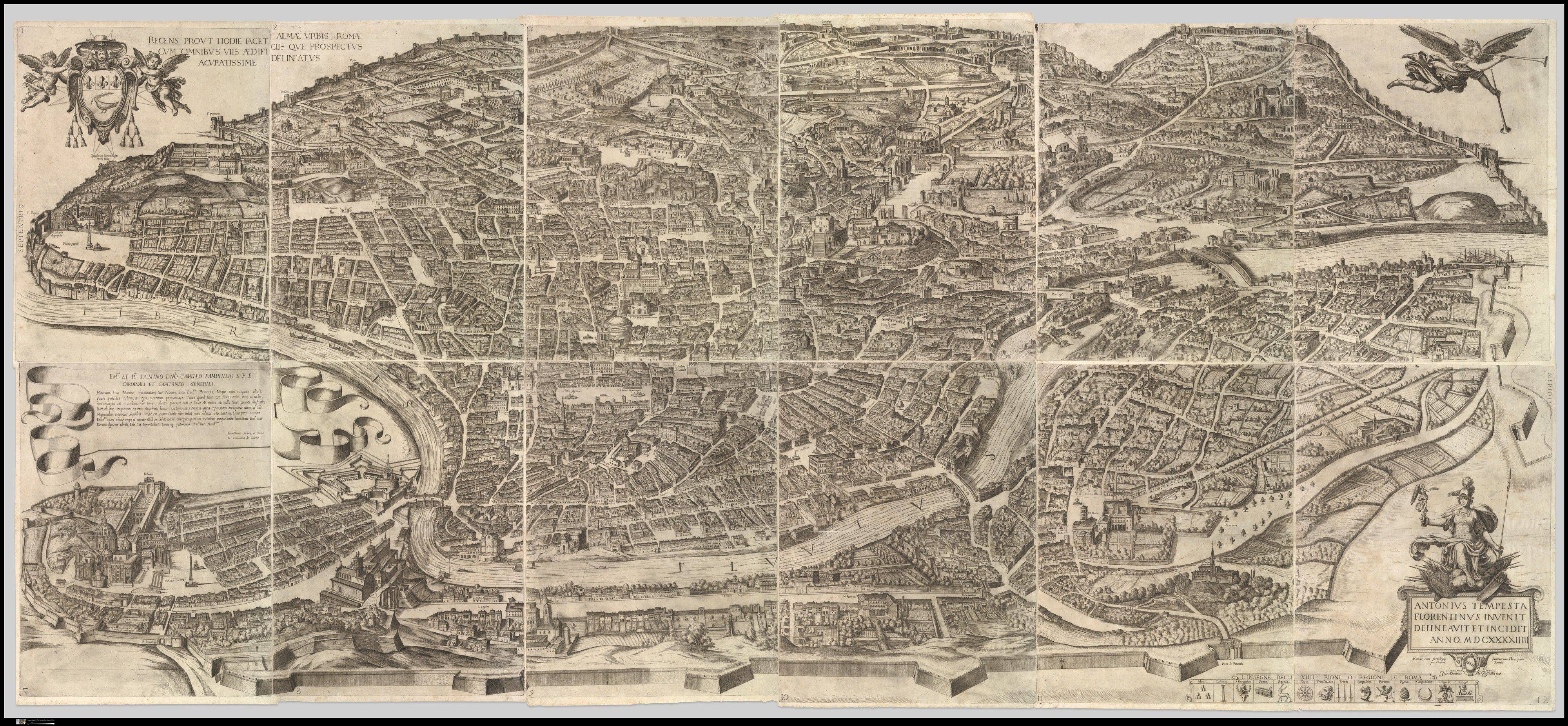 Римские папы оказались главными заказчиками всех этих начинаний. Это явилось общеевропейским почином - в экспозиции можно увидеть подробные планы Рима, созданные, как итальянскими мастерами, так и приглашёнными французами, германцами. Спешно возводились новые храмы – то было вызвано стремлением украсить столицу католического миропорядка. Людьми правят не лишь идеалы - важна красота, и следовало в кратчайшие сроки облагородить Рим - в противовес начавшейся Реформации с её лапидарно-угрюмой эстетикой.