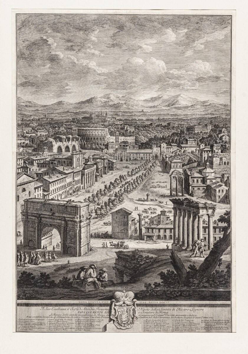 Повышенный интерес к антикам породил традицию графических реконструкций, в коих было много фантазий, так как археология, да и сама история находились в зачаточном состоянии. Тому пример – грандиозная панорама французского архитектора и гравера Этьена Дюперака, представленная на выставке. Эти панорамы имели огромный успех, копировались и переиздавались более двух столетий, оставаясь зримым воплощением грёз о величии Рима.