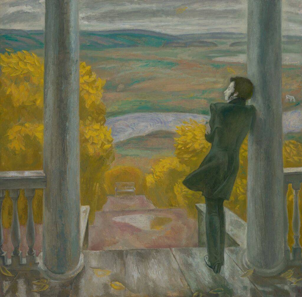 «Небесный» образ художника на крыше разрешается в образе Пушкина — одной из последних картин В. Попкова «Осенние дожди» (1974). Попков не только изучал творчество поэта, путешествовал по Пушкинским местам, жил там и писал этюды, но и примерял, как в своё время деревенщина Есенин, специально заказанные для работы над картиной фрак и цилиндр. Есенин разъезжал по Москве в цилиндре и крылатке, его видели перед зеркалом в цилиндре и с тростью, со злой усмешкой разговаривающим с самим собой. На одном из набросков Попков написал Пушкина перед зеркалом, целящимся из револьвера в своё отражение. Для Попкова, как и для Есенина, разговор с поэтом становится разговором с самим собой. И разговор этот беспощаден. Но картина «Осенние дожди» оказывается благостной, освещающей внемирное. Попков пишет поэта в своей усадьбе в Михайловском как апофеоз одиночества. Одиночества как встречи с собой, как слышания своего внутреннего голоса, как обретения лада. Поэт стоит, облокотившись о колонну веранды, перед ним раскинулась вся грустная просторная красота русской осени, играющая печально-серыми и жёлто-взрывными красками. Но не природа волнует его. Он стоит, сомкнув глаза, и внемлет только себе. Его держит не колонна, но внутреннее чувство одиночества как пристанища для мающейся в мире души. Одиночества как источника свободы и творчества.