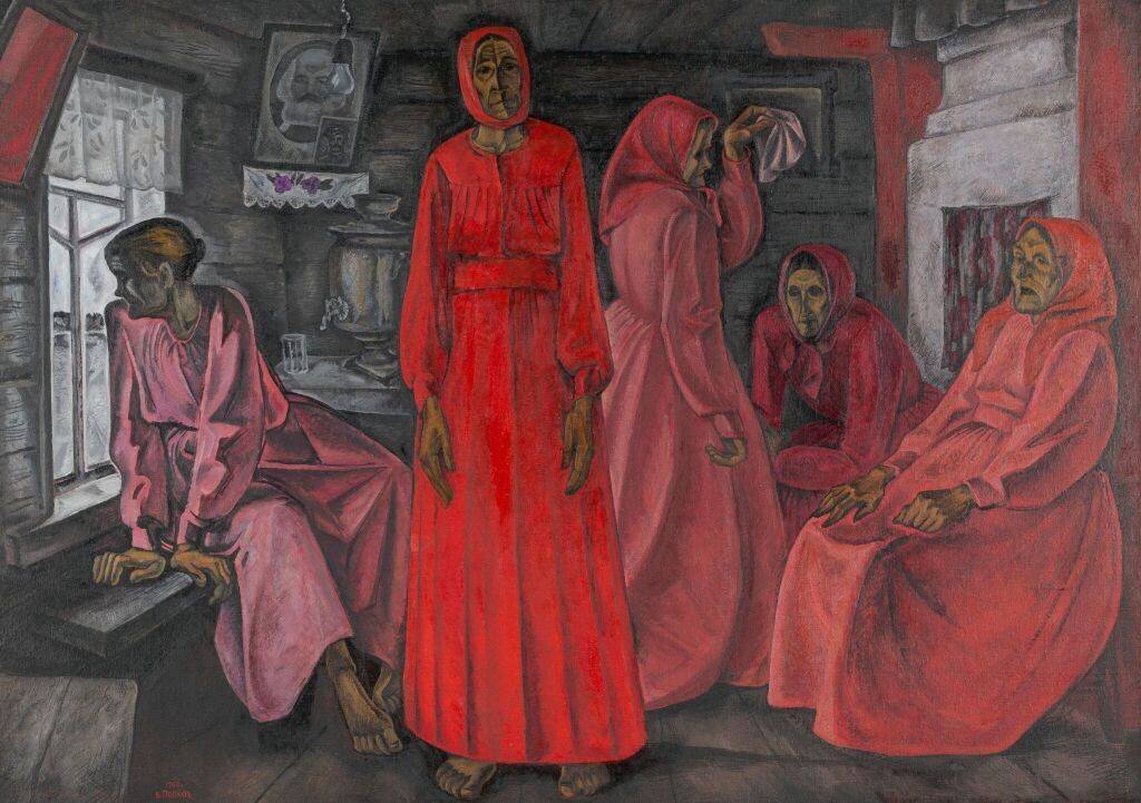 Но на картинах мы видим не быт, не историю и не слёзы, но то, что превыше их. На полотне из Мезенского цикла «Воспоминания. Вдовы» (1966) серый глухой мёртвый фон избы взрывает красный каскад платьев старух. Цвет ошеломляет. Как признаётся сам художник, он решил расположить фигуры по принципу цветка – наподобие пиона с плавным низом и острыми верхними лепестками. Но «цветок» вобрал в себя всю картину. Попков являет нам гипертрофированно вытянутые, по-филоновски аскетичные нечеловеческие лица старух. Их фигуры увеличены по сравнению с масштабом избы, а руки — по сравнению с масштабом фигур. Они словно вестники иного мира врываются алым пятном в эту действительность. Пять фигур, пять оттенков красного. Как говорил Кандинский, книги которого Попков читал, если «общая нота картины печальная и эта нота особенно сконцентрирована на фигуре, одетой в красное… то этот красный цвет платья своим внутренним диссонансом особенно сильно подчёркивает печаль картины и этой главной фигуры. Другой цвет, сам имеющий печальное воздействие, неминуемо ослабил бы впечатление…». Свои старухи есть и у Петрова-Водкина («Старухи», 1909), одинокие, страшные, цвета избы, в которой они заживо погребены. Попков идёт по пути контраста. Он боль заставляет кричать. Он реальность заставляет сообразовываться с драмой. Сюжет о северных вдовах разрастается до притчи о трагедии войны, притча о трагедии войны — до созерцания бренности и покинутости человека на земле. Лица старух возводятся к ликам скорбящего человечества.