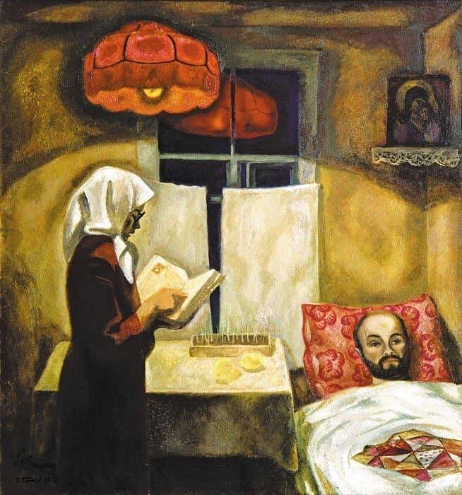 Человек рождается в мире, но места в мире для него нет. «Царство Мое не от мира сего» (Ин. 18:36), — скажет Христос людям. Художник не проповедует святой путь. Он видит лишь безусловность материнской любви. Видит безусловность материнской опоры в Боге – она читает, очевидно, Писание, осенённая благодатью Богородицы, смотрящей на неё с иконы в красном углу. Но безусловное самого художника скромно представлено травкой на столе, что пробивается из земли. Рассада матери дала зыбкие ростки. Зыбкая вера художника и состоит в уповании на то, что ответ должен быть. Этому огромному давящему миру можно противопоставить иное, вечное, правдивое. Его можно найти, постичь, открыть. А пока пусть мать прикроет свое бедное дитятко от мира своей любовью.