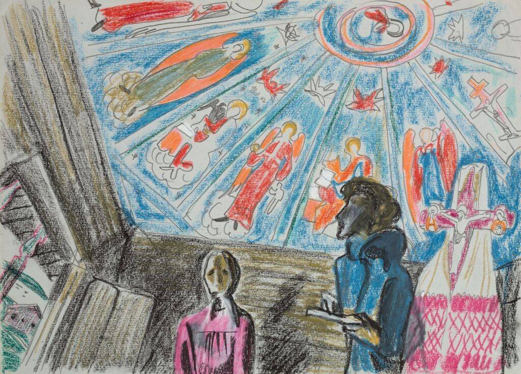 Автопортрет «Воскресенье» (1967) выражает всю суть человека — недосягаемое блаженное одиночество, в котором только и может открыться то, что тебя превышает. На огромном разбелённо-сером полотне шагаловской палитры в однообразную геометрию крыш вписана фигура художника. Лежа полуобнажённым с кувшином вина он глядит в небо с парящими в нём голубями. Специалисты усматривают в этом образе скрытую аллюзию на Распятие: незащищённый человек, среди крыш виднеется церковь, между чёрными голубями притаился белый… Но мечтательная умиротворённость, поза отдохновения с характерно закинутыми за голову руками мешают делать подобные сопоставления. Тревожным «земным» автопортретам, где художник смотрит на нас с риторической растерянностью, вселенским вопросом, страданием или же вовсе спит смертным сном, закрыв глаза, а вместе с этим стерев из сознания и мучения («Работа окончена», 1970; «Игорь, Павел и я», 1974), противостоит этот «небесный» автопортрет на крыше, запечатлевший тот момент, когда вопросы расступаются перед чем-то более значительным. Есть мир, а есть то, что вне мира. Мир — это боль, открытая рана. Внутри мира ответа не найти. Он — по ту сторону.