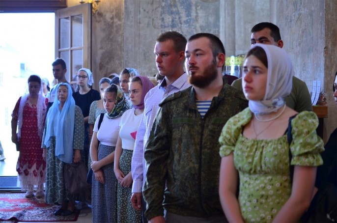 В день Крещения Руси и день памяти равноапостольного князя Владимира, участники молодежного форума собрались за Божественной литургией в Казанском соборе Успенского Вышенского монастыря, у мощей святителя Феофана.
