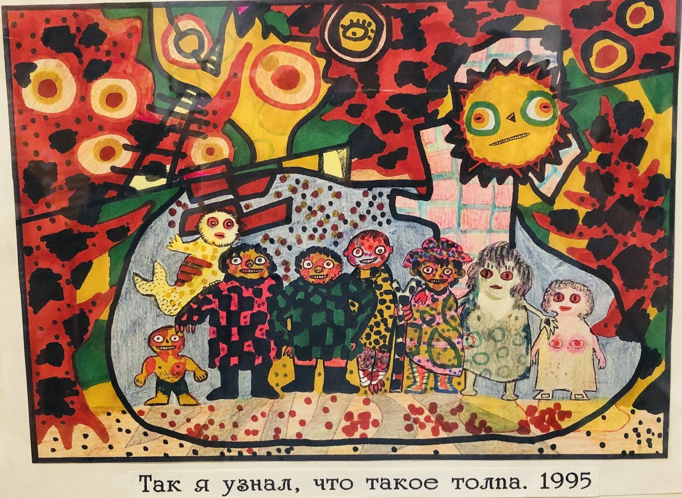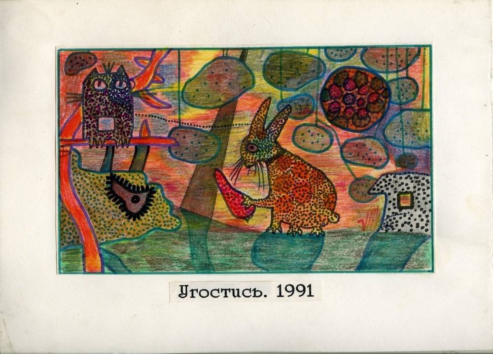 Мы начинаем рассматривать графику Бориса Усова, и сразу на наших губах появляется улыбка, хочется смеяться. Иногда нервно. Перед нами рисунок «Этика и психология семейной смерти», тут, пожалуй, каждый вспомнит о ситуации, когда хоть раз да оказывались врагами «человеку домашние его». Мы видим сомнительное традиционное застолье с родственниками, глаза посторонних (людей ли?), дюжину жадных рук, тянущихся к тарелкам, бесчувственное тело на столе и желтых эмбрионов — порождений и пищу кровожадного чудовища-эгрегора семьи.