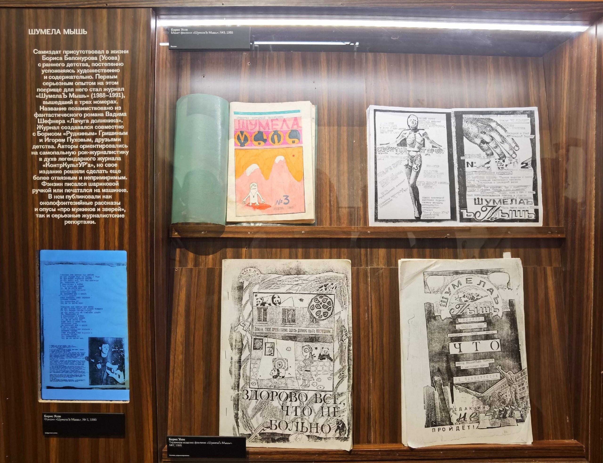 Многочисленные коллажи, обложки самиздатовских журналов: «ШумелаЪ Мышь», «Связь Времен» и «Мир Искусства», собственноручное оформление обложек кассет — это создание и присвоение интересной Усову реальности, некая настройка и интерпретация текстов, музыки, фотографий, кадров — всего того, что он пропускал через себя.