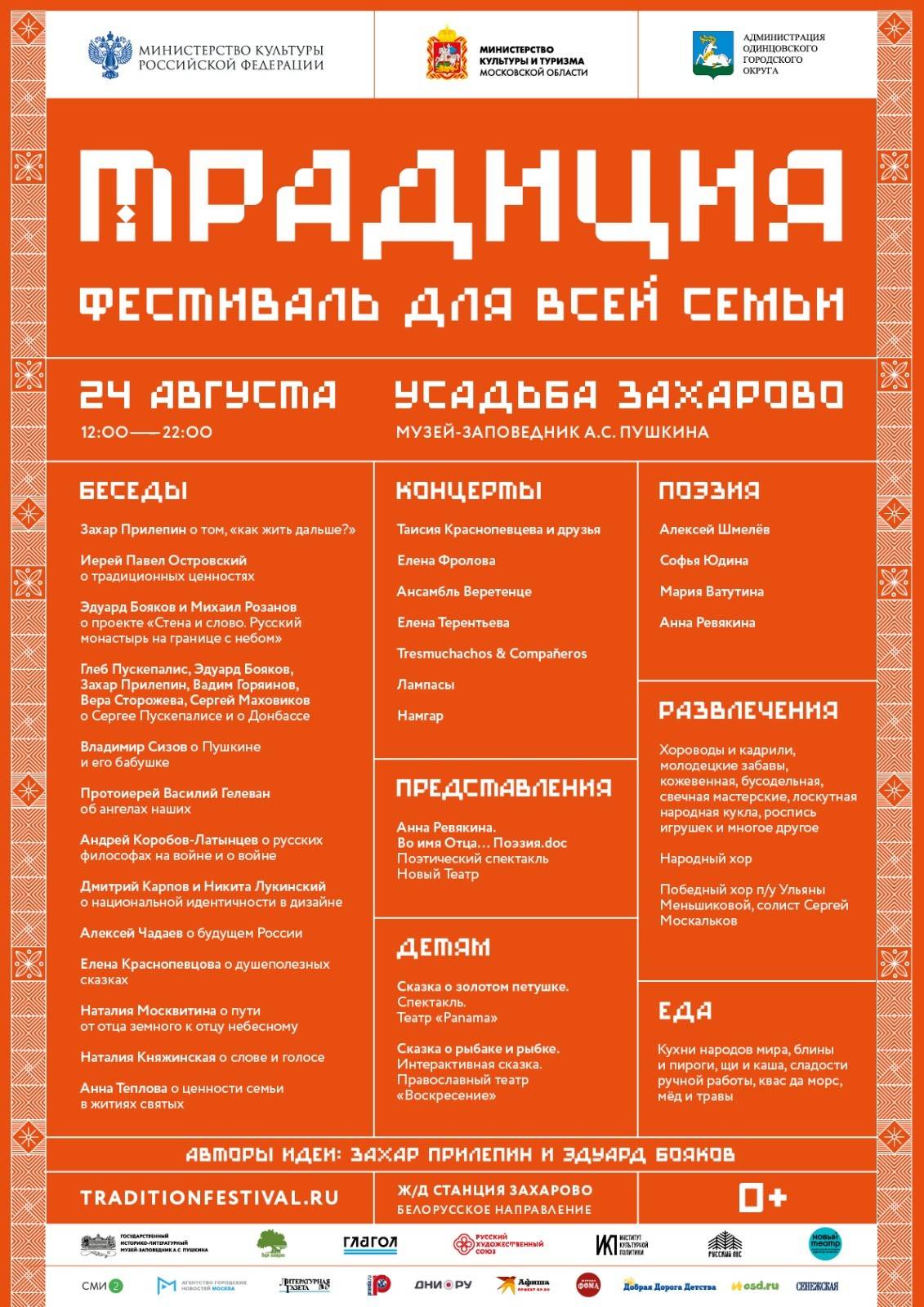 24 августа в усадьбе Захарово (музей-заповедник А.С. Пушкина) при поддержке Министерства культуры РФ, Министерства культуры и туризма Московской области и Администрации Одинцовского городского округа Московской области пройдет девятый по счету ежегодный литературно-музыкальный фестиваль «Традиция».