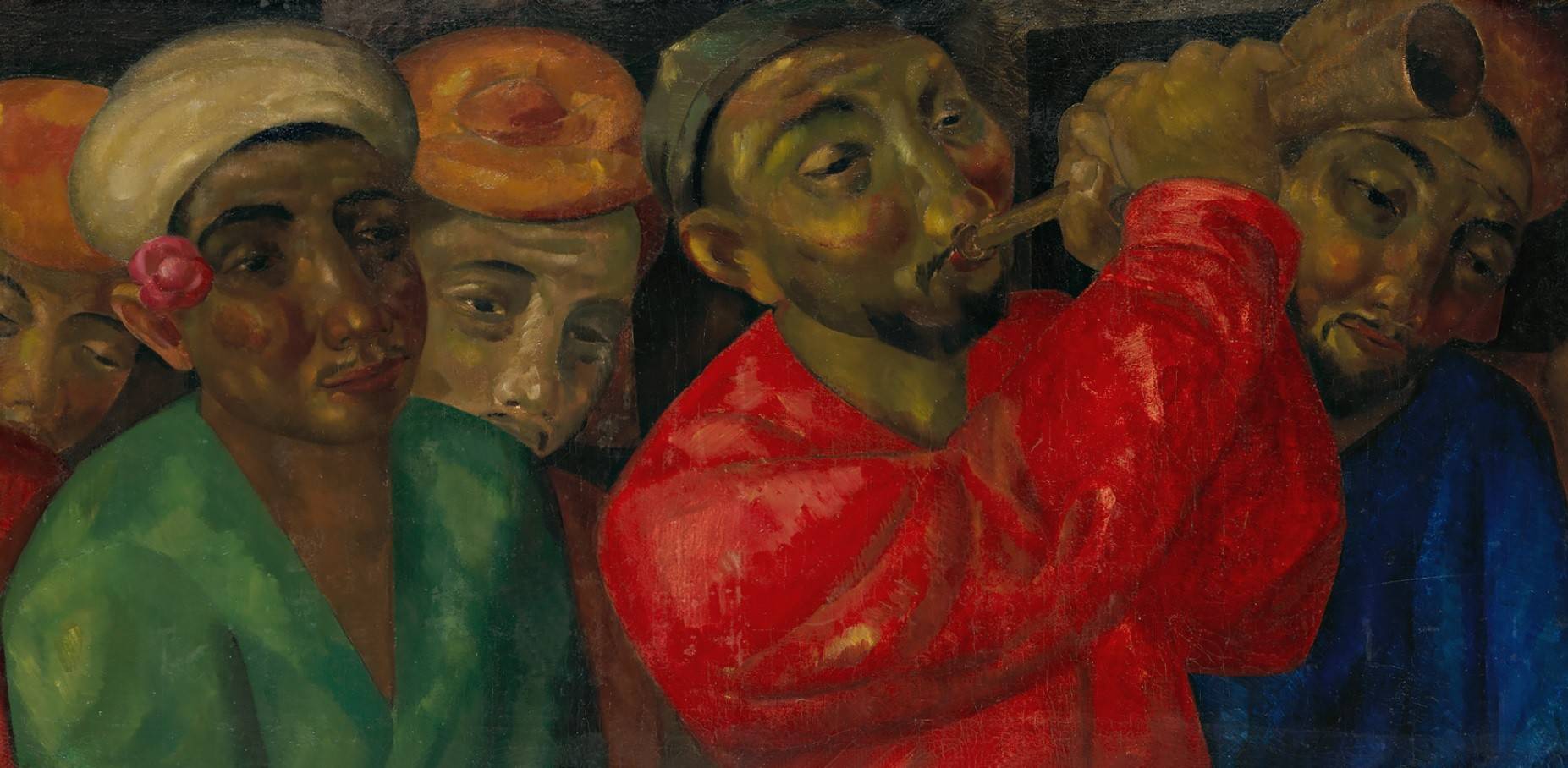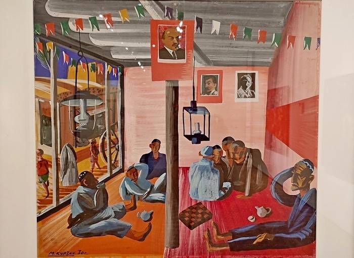 С возведением Турксиба тесно связано искусство группы «Мастера Нового Востока» (1926-1930), сформировавшейся в Ташкенте как фракция при местном отделении Ассоциации художников революционной России (АХРР) — самой крупной в республике творческой организации. Костяк «Мастеров» составляли художники, приехавшие из Барнаула и городов Сибири. Михаил Курзин, с одной стороны изучал народную жизнь, с другой – иронически высмеивал отсталое прошлое. Замечательна его работа «Красная чайхана», где красный – это не колер, а сущность. В те годы по всей стране возводились рабочие клубы, куда мог прийти сознательный пролетарий. На Востоке тоже строились клубы, но точкой сборки всё равно оставалась чайхана, которая для узбека столь же важна, как паб для англичанина. В чайхане испокон веков обсуждали политические события, заключали сделки, беседовали о жизни, играли в азартные игры. «Красная чайхана» — это прообраз клуба – тут портреты Ленина и Сталина, шахматы, флажки. Новое на базе привычного.