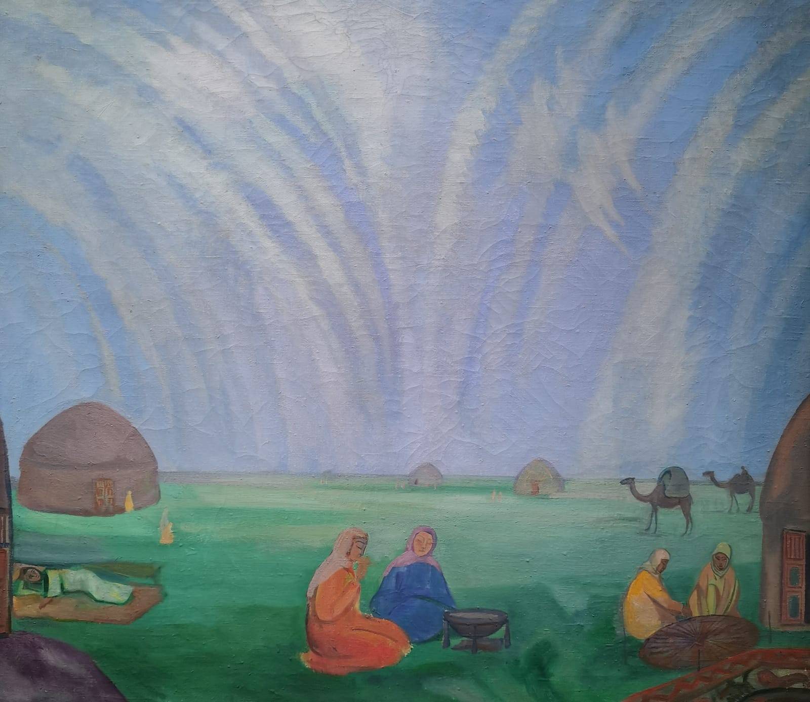 Не обошлось и без знаменитостей. Павел Кузнецов, один из ведущих мастеров Серебряного века, участник «Мира искусства» и «Голубой розы», всегда интересовался туркестанским регионом – точнее в 1910-х годах он поехал Бухару да потом и в киргизские степи для того, чтобы преодолеть творческий кризис. Тому пример – картина «Мираж в степи», созданная в 1912 году. Тонкий синий цвет – небо. Свежая зелень, юрты, кочевники – это впечатление зачарованного европейца. «Туркестан – страна неуспокоительного блаженства. Его степное небо, как гигантское зеркало, отражает и чудесно преломляет в своих странных миражах громадные города с минаретами, мечетями, верблюдами, птицами и людьми. Кто достиг увидеть это фантастическое степное небо, тот определил жизнь на десятки тысяч лет», - констатировал Кузнецов.