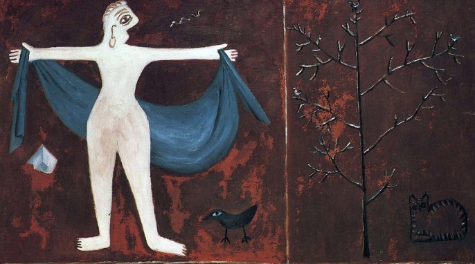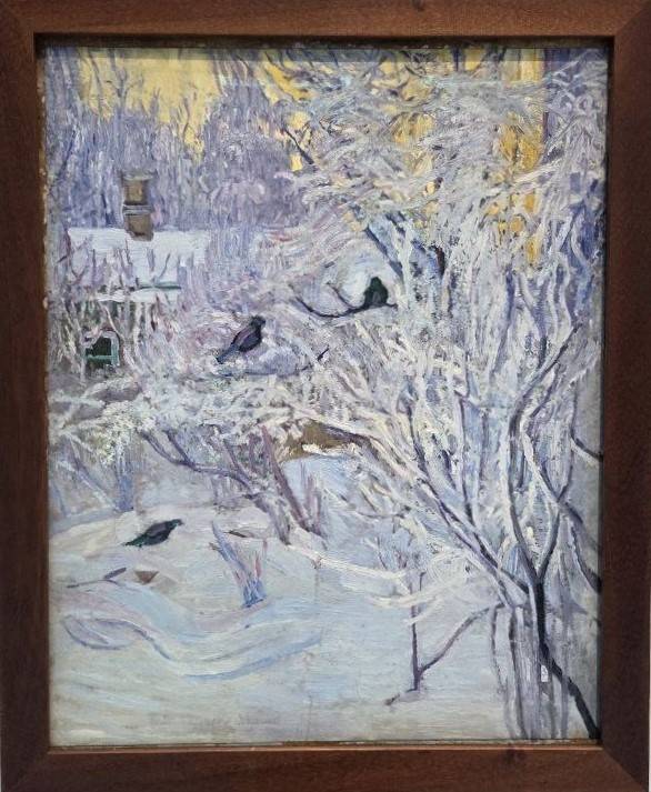 Всё то же – у Ольги Розановой, которая аккуратненько следует за кубистами и супрематистами – её «Рабочая шкатулка» напоминает рекламу или вывеску. Её импрессионистская «Зима. Снегири» куда как естественнее. Однако Розанова слыла девой-музой для Алексея Кручёных и Владимира Маяковского, посвящавших ей свои поэтические циклы.