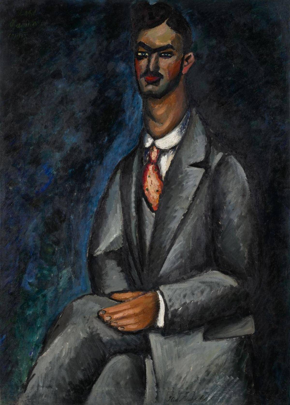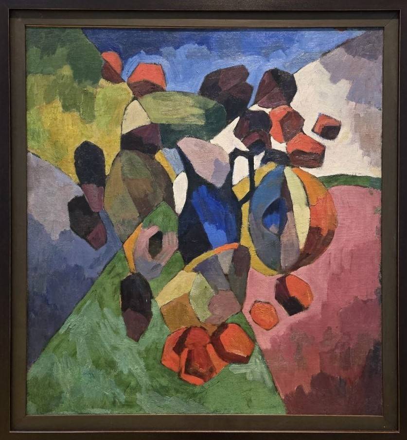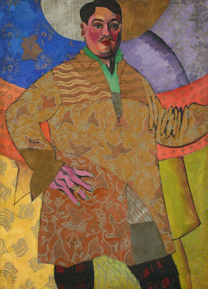 Не меньшим хулиганом был и Аристарх Лентулов – каждая из его картин излучает восторг перед силой дня. Мастер признавался: «Моя страсть к солнцу и яркому свету сопутствовала мне, что называется, со дня моего рождения». Среди экспонатов – его автопортрет в забавной рубахе, словно бы сотканной из всех оттенков жёлтого и оранжевого. На художнике – штаны в красно-чёрную клетку, а лицо сияет крепким румянцем. Художник слыл жизнелюбом – в юности стройный, он стремительно располнел к тридцати годам, что мы и наблюдаем на автопортрете. Приём Лентулова – дробить и расщеплять пространство. Это не кубизм, которым он увлекался – здесь неподражаемый почерк. При всё том, композиция не распадается на части – она цельна и внятна. Тому пример – «Натюрморт с синим кувшином», где всё предстаёт в виде колористических фрагментов, но это проще простого «собрать» воедино.