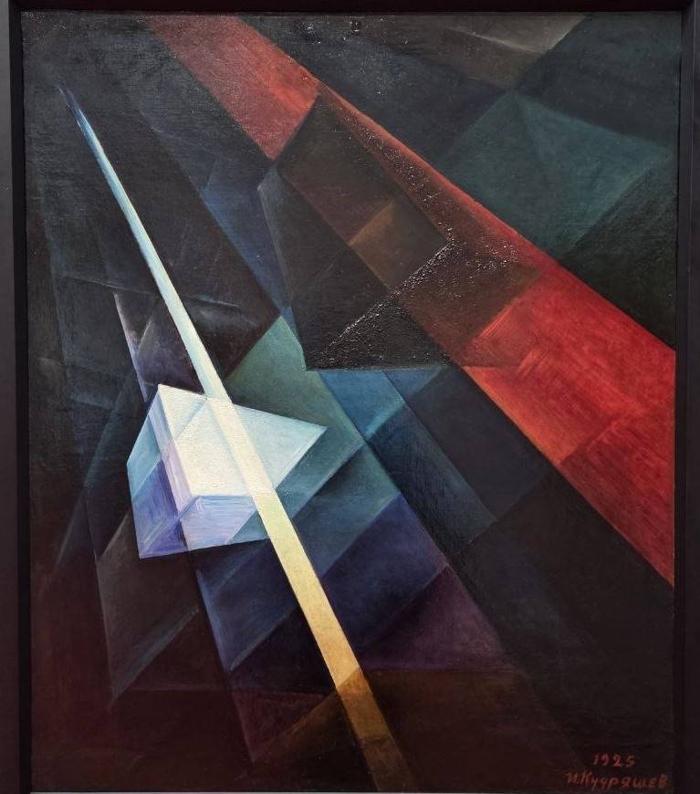 Иван Кудряшов – совсем иное дело. Никаких закоулков разума. Всё кристально-зримо. Его кумиром был Константин Циолковский, мечтавший о покорении галактик, а учителем – Казимир Малевич, утверждавший, что «Человек тоже космос, возле которого вертятся солнца и их системы, так, возле него в вихре вертятся все созданные им предметы, он, как Солнце, руководит ими и влечет за собою в неведомый ему путь бесконечного в звоне беспредметного движения ритмического вихря Вселенной». Кудряшов выпестовал фантастический стиль, выйдя за рамки супрематизма. «Конструкция прямолинейного движения» — это упоение безмерностью и попытка выразить невыразимое. Стройная геометрия и – магия нюансов, динамика, порыв – так видятся миры Ивана Кудряшова, узревшего на своём веку полёты в космос.