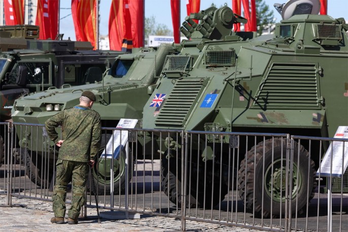 Фото: Сергей Булкин/ТАСС. Посетитель на выставке трофейной техники из стран НАТО, где представлены 32 образца различной бронетехники перед Музеем Победы на Поклонной горе.