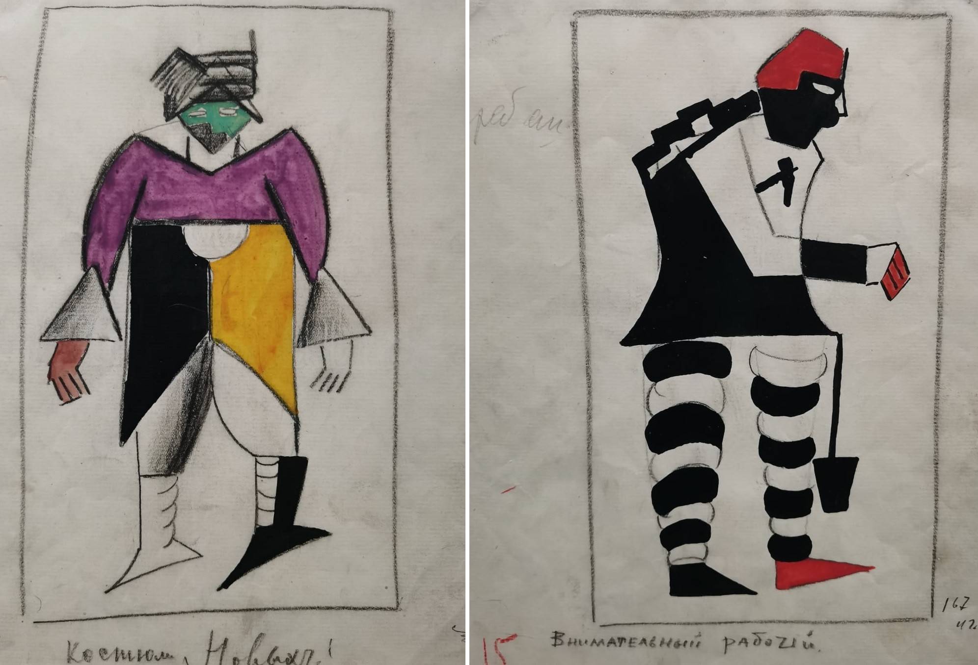 На выставке представлены эскизы костюмов, созданные Казимиром Малевичем для футуристического спектакля «Победа над Солнцем» Алексея Кручёных и Михаила Матюшина. При всей своей нарочитой алогичности и причудах, эта штука была чёткой по своим идейным установкам. Замышлялось электромеханическое действо, знаменующее триумф передовой техники над природой и слабым, ничтожным человеком-сапиенс, который признавался чем-то, вроде тупика мироздания.
