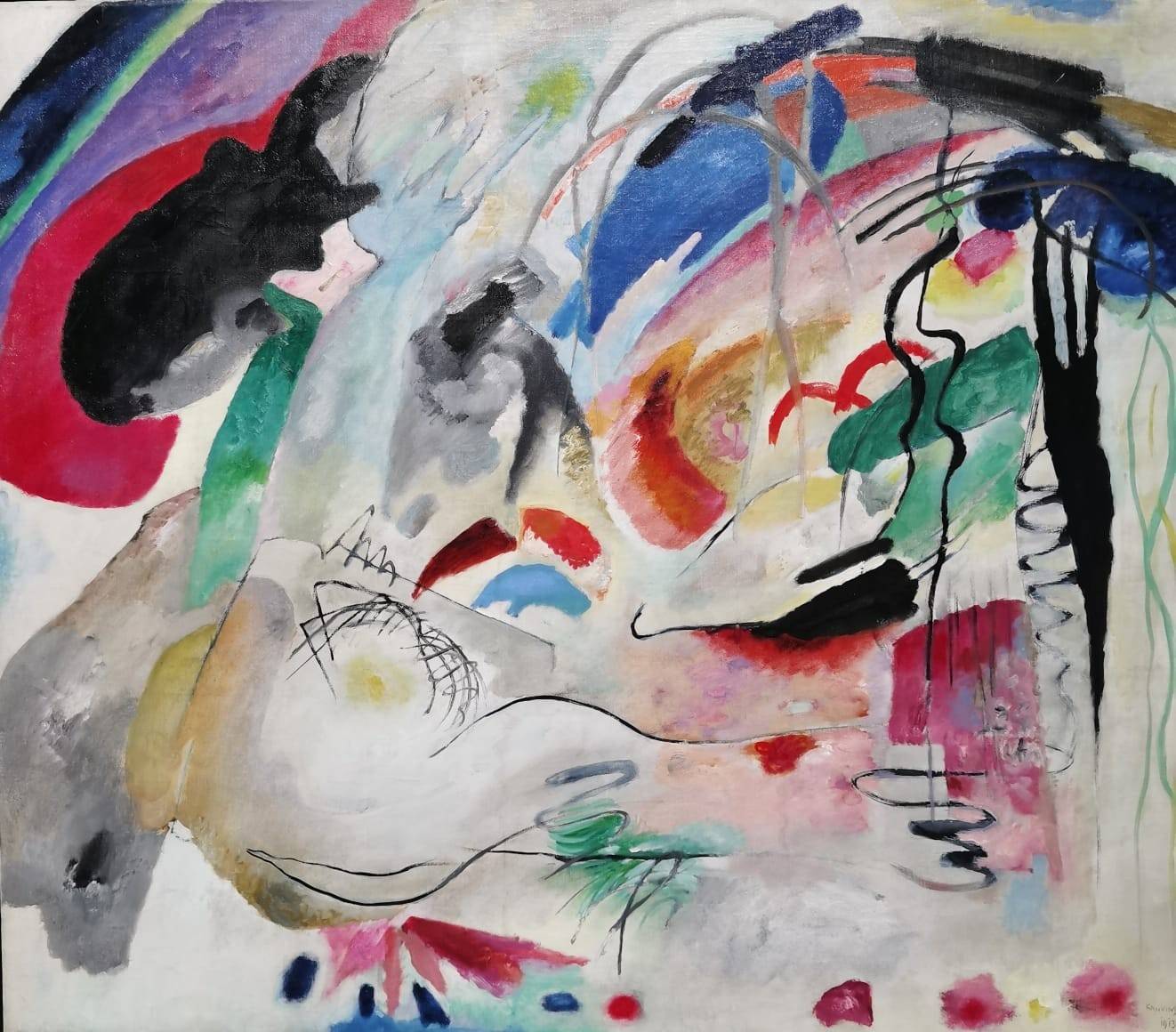 Василий Кандинский, чью «Импровизацию» мы также наблюдаем на выставке, писал: «Чёрный цвет внутренне звучит, как Ничто без возможностей, как мёртвое. Ничто после угасания солнца, как вечное безмолвие без будущности и надежды. Представленное музыкально, чёрное является полной заключительной паузой, после которой идёт продолжение подобно началу нового мира, так как, благодаря этой паузе, завершенное закончено на все времена — круг замкнулся». Но в данном случае – квадрат. Скандальная вещица Малевича была предъявлена зрителю на петроградской выставке «0, 10» в 1915 году, а до этого был манифест супрематистов.