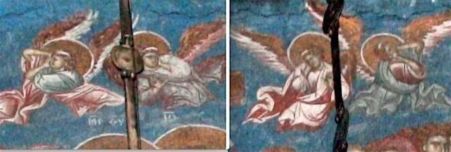 «Кораблей» на фресках два, оба летят друг за другом с запада на восток! В первом сидит человек без ангельского ореола. Одной рукой он держится за невидимый «рычаг управления» и оглядывается назад. Создаётся впечатление, что «космонавт» следит за полетом следующего за ним товарища.