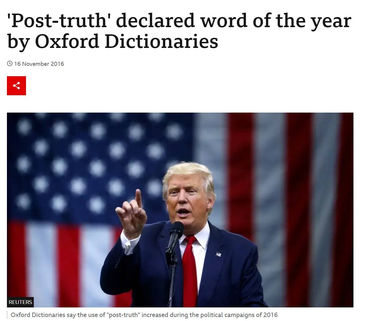 Все общественные дискуссии из плоскости доказательств и фактов перешли в плоскость доверия и «моё слово против твоего». Возросло количество теорий заговора (QAnon, Пиццагейт, Глубинное государство). Своего апогея оно достигнет в пандемию. Сторонники разных партий начали существовать в «эхокамерах» или по-простому информационных пузырях.