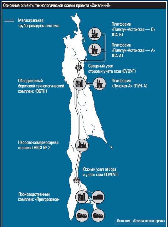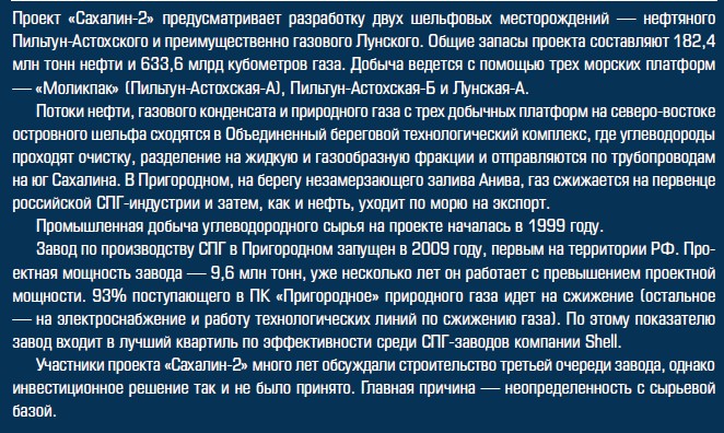 В 1991 году Российская Федерация провела первый конкурс среди иностранных фирм на освоение углеводородных ресурсов недр сахалинского шельфа. По его итогам в 1994 году было подписано соглашение о разделе продукции (СРП) с консорциумом инофирм по проекту «Сахалин-2», а спустя год — с другим консорциумом по проекту «Сахалин-1» и также на условиях СРП. В 1996-м, после принятия и вступления в силу Федерального закона «О соглашениях о разделе продукции», оба этих проекта с иностранным участием и соглашения по ним вступили в силу. Всего же в программу лицензирования участков недр сахалинского шельфа для конкурсного предоставления их в пользование было включено девять участков, получивших порядковые номера от 1 до 9. Так в обиход вошло понятие «девять “Сахалинов”». В силу разных причин сегодня добыча ведется только на вышеназванных двух лицензионных участках. Еще на трех («Сахалин-3», куда входят четыре блока, «Сахалин-4» и «Сахалин-5») имеются недропользователи, уже только российские, и ведутся работы. Где-то открыты месторождения и есть заявленные сроки их ожидаемого ввода в эксплуатацию. На четырех участках («Сахалин 6–9») никаких работ и/или переговоров по лицензионным участкам не ведется (см. таблицу).