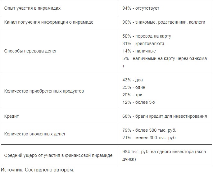 Таким образом, анализируя представленные данные, можно составить краткий портрет стандартного вкладчика в финансовую пирамиду: это женщина (реже мужчина), в возрасте от 30 до 49 лет, имеющая высшее (возможно даже экономическое или финансовое) образование, без опыта инвестирования, в прошлом имеющая открытое уголовное дело. Представитель данной возрастной группы относится к числу миллениалов (поколение Y), родившихся во времена СССР. «Дети-миллениалы» застали перестройку, а их взросление пришлось на девяностые годы. Они более склонны к импульсивным покупкам и склонны вкладывать деньги для дальнейшего их сбережения и приумножения. Также в различных источниках отмечается, что поколение Y использует микрозаймы как один из ходовых финансовых инструментов, стараясь найти «свою» микрофинансовую организацию для регулярного и более выгодного сотрудничества. Вместе с тем, именно микрофинансовые организации являются наиболее распространёнными субъектами, осуществляющими незаконную финансовую деятельность.
